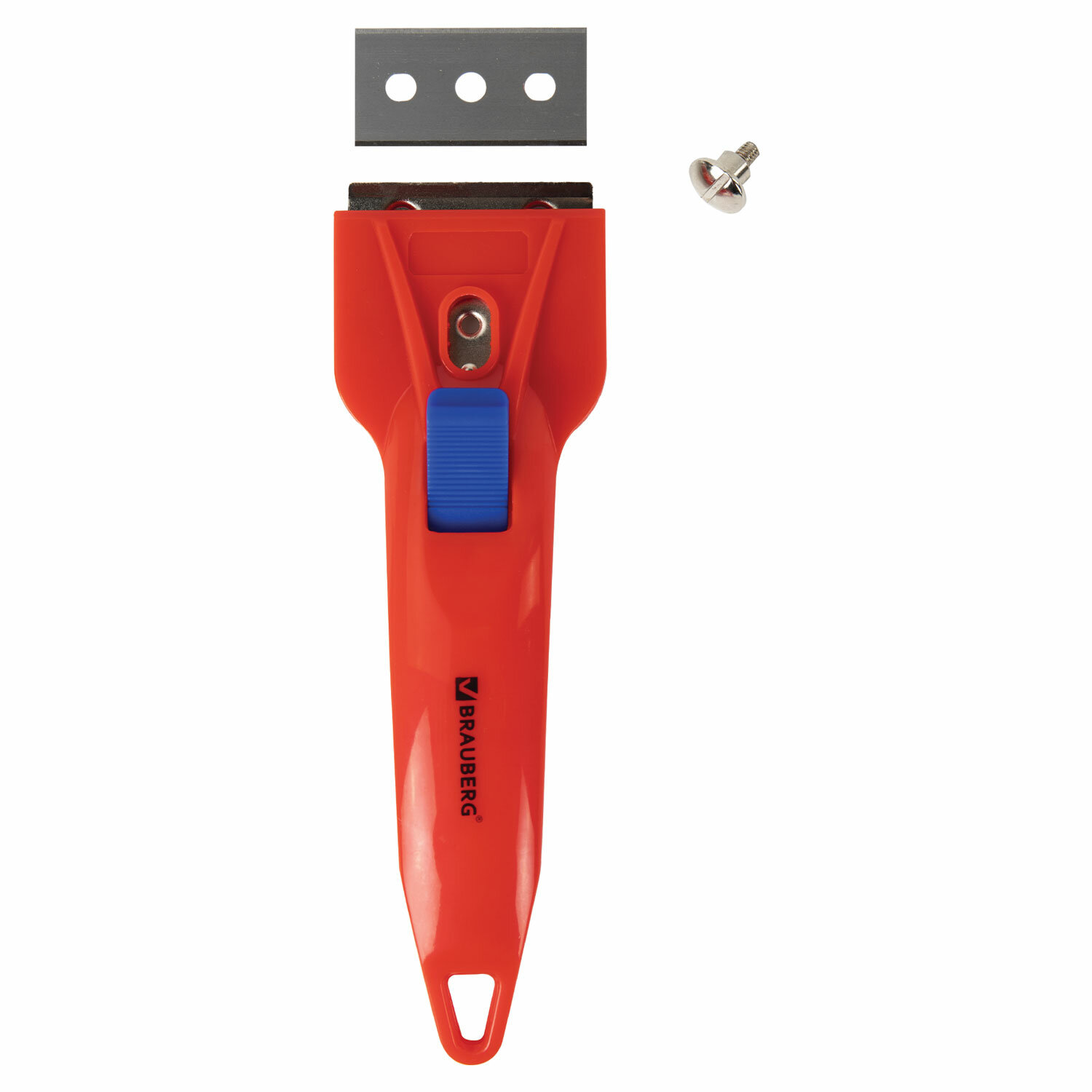 Прежде чем сдвинуть фиксатор, нужно ослабить винт, находящийся между лезвием и самим фиксатором. Это необходимо для жесткой фиксации лезвия, что в свою очередь исключает его задвигания внутрь при интенсивной работе скребком.