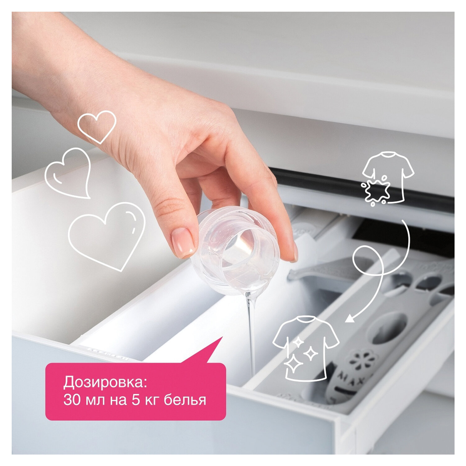 На 5 кг белья достаточно добавить 30 мл кондиционера. Средство заливается в специальный отсек стиральной машины для использования во время последнего полоскания.