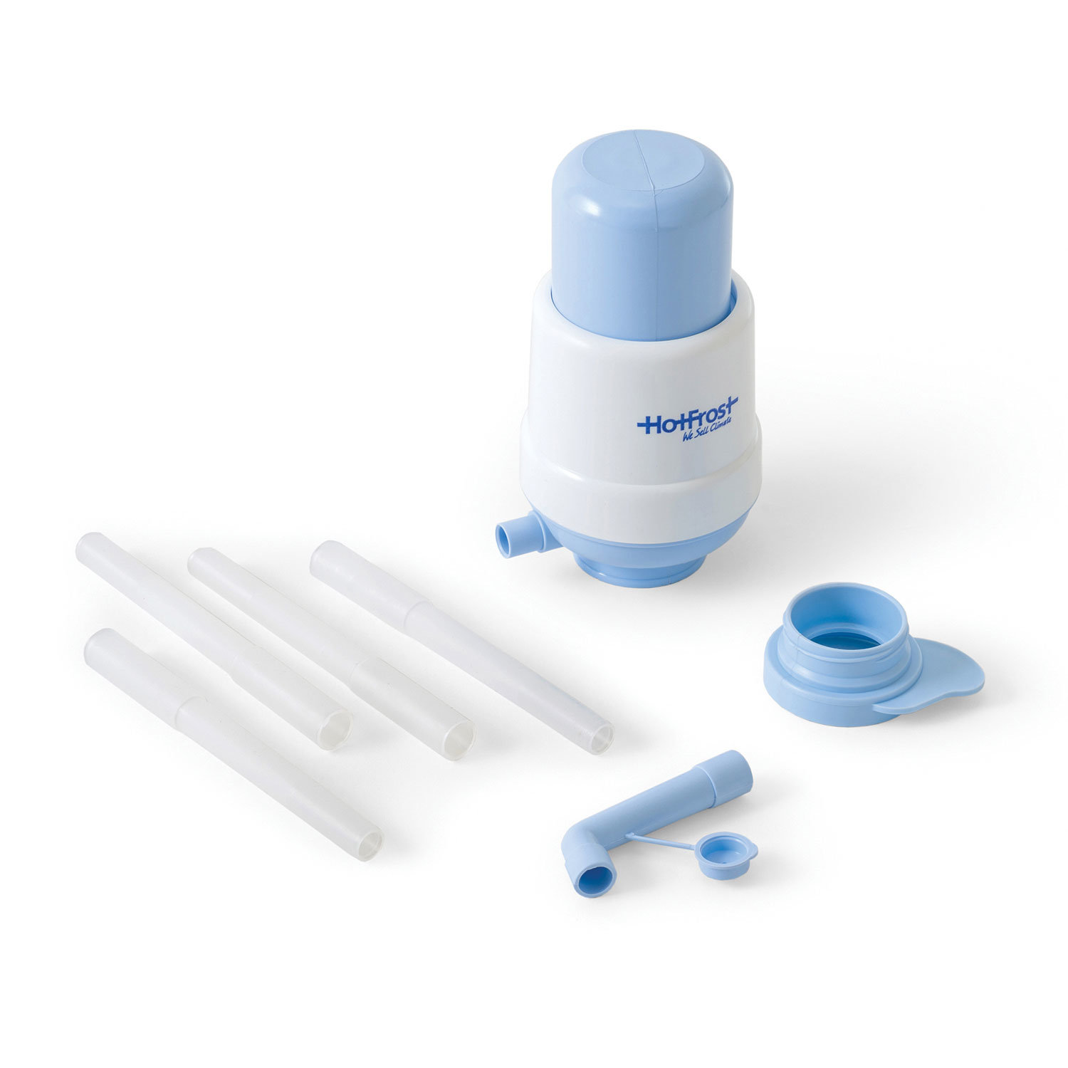 Тип помпы: механический Тип установки: на бутыль (бутыль в комплект не входит) Материал корпуса: пластик Цвет: белый, голубой Высота: 17.5 см Диаметр: 9.3 см Комплектация: инструкция, носик, помпа, пробка для носика, телескопические трубки